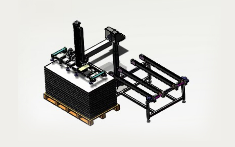 自動排版機的主要功能單元有:玻璃輸送定位系統、抓取行走系統、視覺檢測系統、電控系統等;通過以上功能單元,實現了將自動串焊機串焊好的電池串,按照工藝尺寸要求和排版方向順序自動排版鋪設到玻璃(EVA已經鋪設)上,組成電池串陣列。玻璃/EVA通過傳輸線傳輸至指定位置,機械手抓取電池串實現CCD定位、自動旋轉、自動排版功能。設備通過同步帶傳輸與自動生產線對接,實現了自動流水作業。
